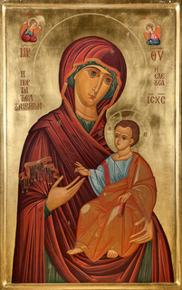В 829 году император Феофил начал преследовать почитателей святых икон. По всей империи были разосланы царские воины отыскивать иконы и уничтожать их, а почитавших их жестоко мучить. Один из воинов, увидя у вдовы икону, с гневом ударил мечом в ланиту Богоматери, изображенной на иконе. Но Пресвятая Владычица вразумила заблуждающегося. К ужасу воина из язвы потекла кровь. Пораженный этим, воин с раскаянием пал пред иконою Богородицы, оставил ересь и окончил жизнь иноком. Вдове он посоветовал скрыть икону, чтобы спасти от поруганий. Усердно помолясь пред иконою Богородицы, благочестивая вдова поставила ее в небольшую лодку и пустила в море, прося Пресвятую Владычицу спасти икону от потопления, а ее и сына от жестокости нечестивого царя. Пресвятая Богородица услышала усердную молитву этой благочестивой женщины. Отпустив икону, которая к ее радости, стоя прямо, понеслась к западу, вдова сказала своему сыну: «Дорогое дитя мое, я женщина и не могу уйти далеко, потому или скроюсь, или, если меня схватят, умру ради любви к Богоматери, а ты удались в Грецию, чтобы царские воины не сделали тебе зла». Любящий сын послушался совета матери, ушел в Солунь, а через 15 лет прибыл на Афон и постригся в монахи в Иверской обители. Тут он увидал святую икону, пущенную в море его матерью и рассказал монахам, почему его мать должна была расстаться с драгоценною святынею. Явление этой иконы на Афоне произошло следующим образом: однажды вечером иноки древней Иверской обители увидели на море огненный столп, восходящий до самого неба. Дивное явление продолжалось несколько дней и ночей. Приплыв ближе к явлению, они увидели, что огненный столп исходит от иконы Богоматери, но когда приближались к ней, чтобы взять ее, лодка с иконой удалялась. Иноки собрались в храме и в усердной молитве просили Богоматерь даровать им свою икону. Между братьями этой обители был старец Гавриил, грузин, отличавшейся особенно строгою жизнию. Ему во сне явилась Богоматерь и сказала: «Возвести настоятелю и братии, что Я хочу дать им икону Мою в покров и помощь, и, войдя в море, иди с верою по волнам, тогда все узнают Мою любовь и благоволение к вашей обители». Старец открыл волю Богоматери настоятелю; все иноки с молебным пением, кадилами и лампадами пошли к морю. Икона Пресвятой Богородицы приближалась к ним. Гавриил вошел в море и взял икону. Когда он вышел на берег и поставил на нем икону, из земли потекла чистая, сладкая вода, текущая и доселе. Это место находится в четверти часа ходьбы от обители и здесь устроена была часовня. После усердной молитвы, икону торжественно внесли в соборный храм обители. На другой день инок, зажигавший лампады в храме, войдя в него, не нашел иконы Богоматери на ее месте во храме. Ее нашли над воротами обители на наружной стене и опять поставили в храм; но на другой день она опять явилась над воротами, и это повторялось несколько раз. Наконец, Богоматерь явилась старцу Гавриилу и сказала: «Иди в монастырь и скажи инокам, чтобы более не искушали Меня. Не для того Я прибыла, чтобы вы охраняли Меня, но чтобы Я охраняла вас не только в настоящей жизни, но и в будущей. Да уповают на милосердие Сына Моего все здесь пребывающие в добродетельном житии и страхе Божием. И вот вам знамение: доколе икона Моя будет в обители вашей, дотоле благодать и милость Сына Моего к вам не оску